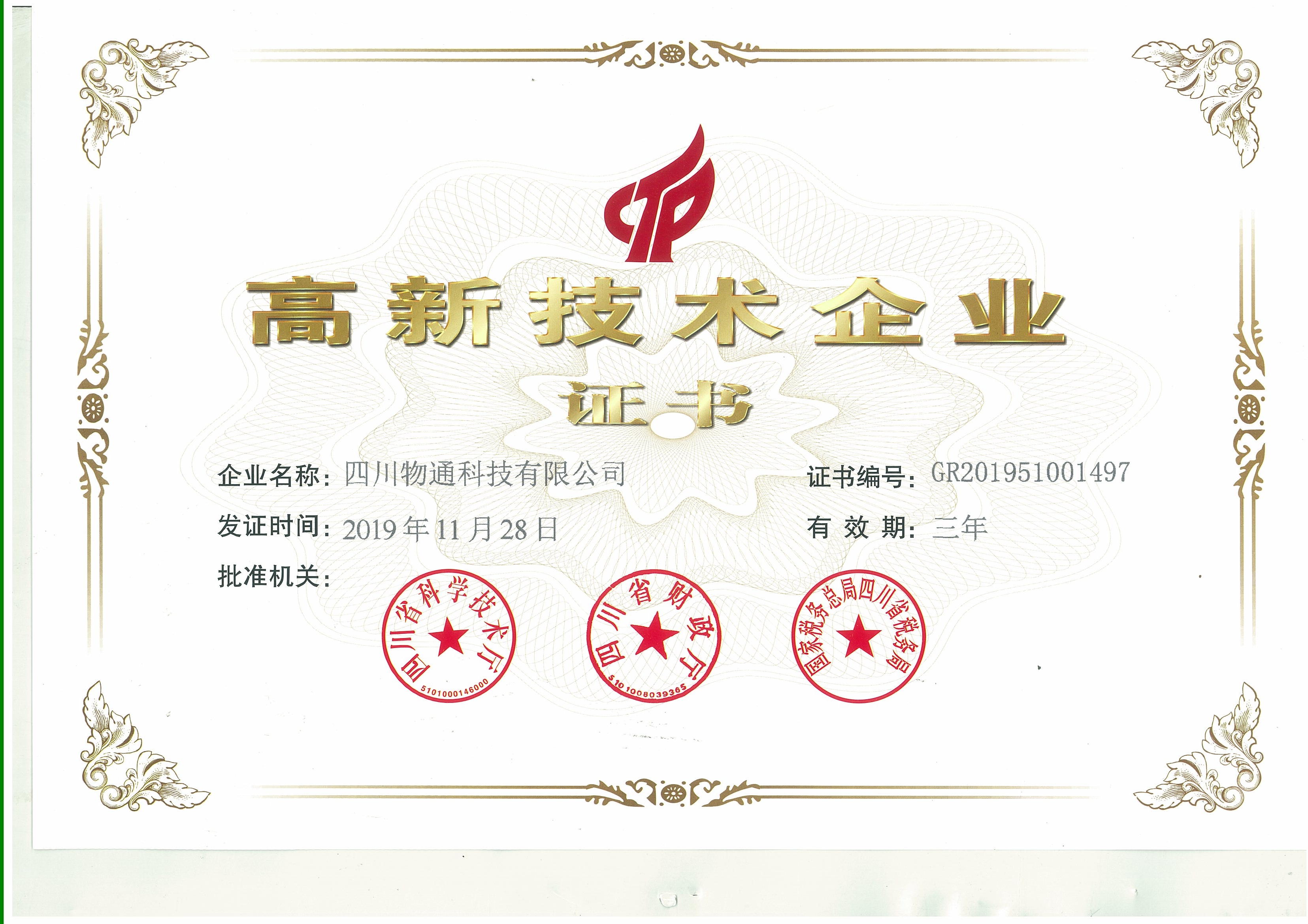 熱烈祝賀四川物通科技集團(tuán)有限公司取得高新技術(shù)企業(yè)證書!