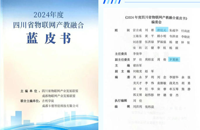 同時(shí),公司創(chuàng)始人唐廷元先生受聘為四川省物聯(lián)網(wǎng)產(chǎn)教融合專家顧問(wèn),CTO羅翼鵬先生擔(dān)任副主任委員,深度參與《2024年度四川省物聯(lián)網(wǎng)產(chǎn)教融合藍(lán)皮書(shū)》的編撰工作。